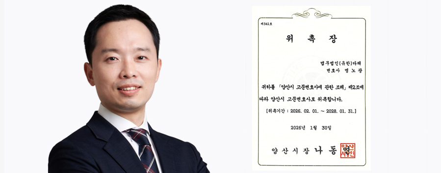 명노광 파트너 변호사, 양산시 고문변호사 위촉조회수72작성일2일 전 법무법인(유한)다래 명노광 파트너 변호사가 양산시 고문변호사로 위촉되었습니다.위촉기간: 2026. 02. 01 ~ 2028. 01. 31